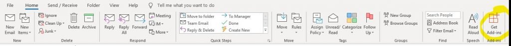 With our documents all in the cloud now, we need to save our attachments. “Uploading” is a pain. So welcome to this free add-on for Outlook which makes it easy to upload files directly. Again, it’s in the add-in section of Outlook and all you need to do is pick it from the task bar. Once you’ve repeated the process above, but adding OnePlaceMail add-in you can use the convenient button highlighted below:
