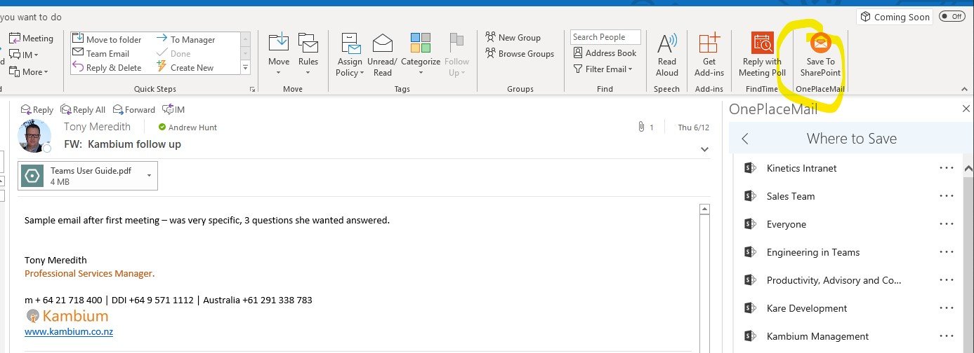 3. Copy attachments quickly to Teams, OneDrive or SharePoint, with OnePlace
